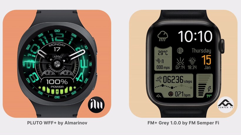 Meanwhile, the best overall watch faces—shown above—went to ‘Pluto WFF’ by Almarinov for Wear OS and ‘FM + Grey’ by FM Semper Fi for the Apple Watch.