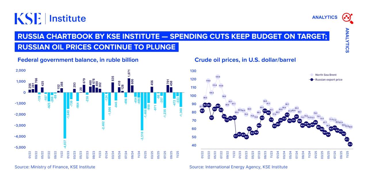 Russia managed to keep its 2025 federal budget broadly on target through spending cuts, domestic borrowing and higher oil export volumes, even as crude prices fell sharply and economic growth slowed, according to the January Russia Chartbook published by the KSE Institute.