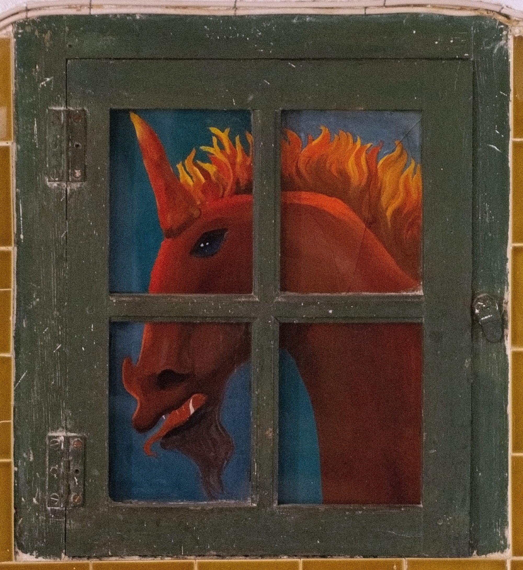 “Window in Saint-Martin-d’Ardèche” (1938), painting on glass, 39.3 x 28.3 x 2.7 centimeters. Private collection, © 2026 Estate of Leonora Carrington / ADAGP, Paris. © Michel Tissot dit Daubery