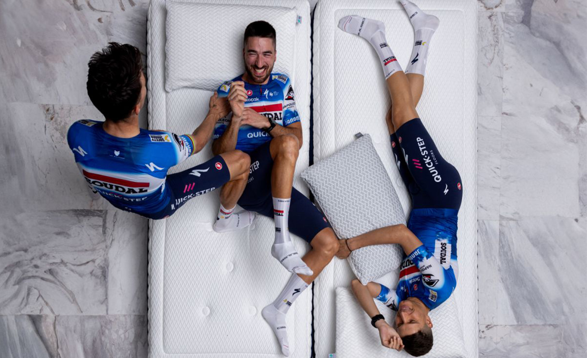 This QuickStep tradition has been going on for decades, through a couple of different sponsors. The definitive pillow photoshoot provider is Latexco, but when that company was victim of a merger, the Italian company Manifattura Falomo stepped into the breach from 2024 onwards. We have no way of knowing the specifics of how this fourth-tier ‘official partnership’ deal was sold to the Italians, but we can probably assume that at least at some level, the powers behind the team wanted continuity on the pillowfight photoshoot front.