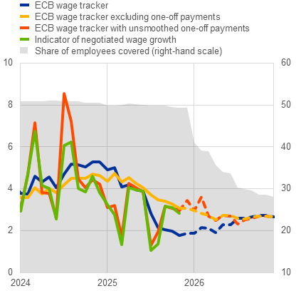 The European Central Bank (ECB) wage tracker, which covers active collective bargaining agreements, indicates negotiated wage growth with smoothed one-off payments of 3.2% in 2025 (based on a coverage of 49.9% of employees in participating countries) and 2.4% in 2026 (based on a coverage of 33.1%). Compared with the December 2025 data release, the ECB wage tracker with smoothed one-off payments was revised up by 0.1 percentage points for 2026. The ECB wage tracker with unsmoothed one-off payments indicates negotiated wage growth of 3.0% in 2025 and 2.7% in 2026. The wage tracker excluding one-off payments indicates an easing of negotiated wage growth from 3.9% in 2025 to 2.7% in 2026 (revised up by 0.1 percentage points for 2026).