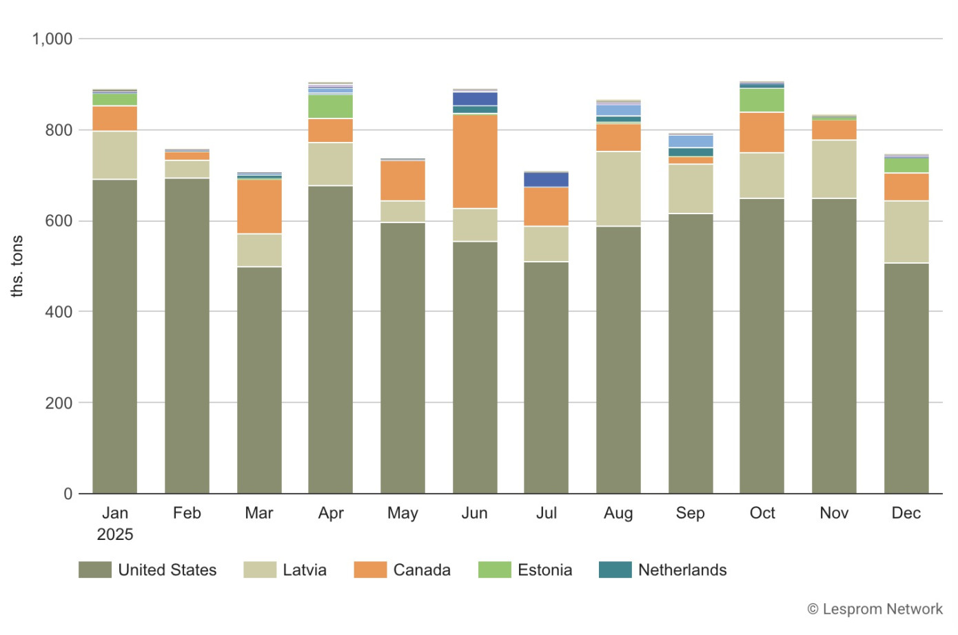 Image: United Kingdom wood pellet imports by supplier, monthly volumes in 2025 (thousand tons) / Lesprom Analytics