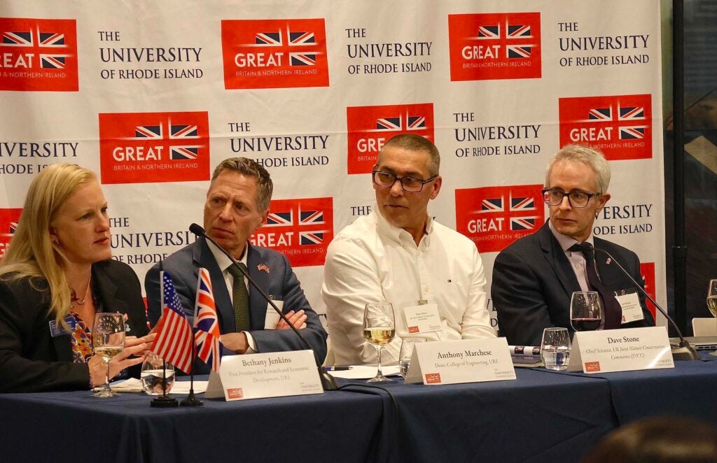 A panel discussion highlighted collaborative and innovative efforts between URI, Rhode Island, and the UK in ocean research, conservation, and technology. From left, Bethany Jenkins, URI vice president for Research and Economic Development; Anthony Marchese, dean of URI’s College of Engineering; Dave Stone, chief scientist, UK Joint Nature Conservation Committee; and Jon Boswell, head of Strategic Funding, UK Department for Environment, Food and Rural Affairs.