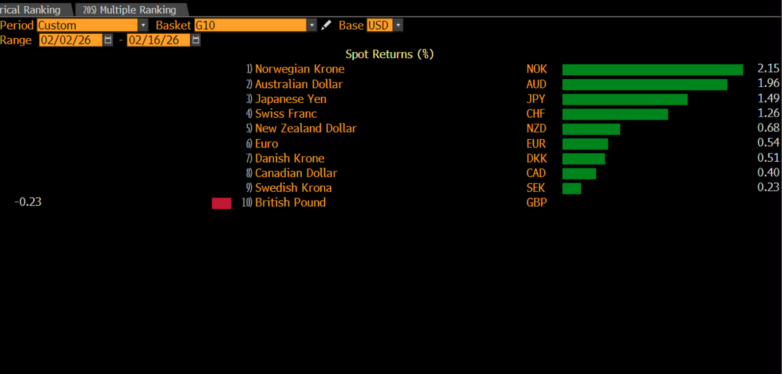 Chart 1: The dollar vs. the G10 FX space since the start of February. The pound is the only currency to post a loss against the dollar so far in February.