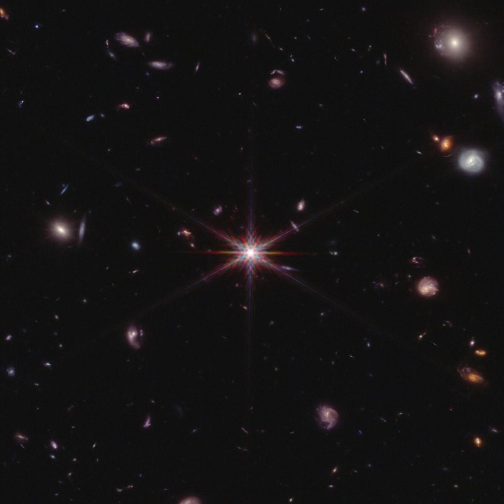 *This is a JWST NIRCam image of Quasar SDSS J0100+2802 and other distant galaxies of various types. SDSS J0100+2802 is a hyperluminous quasar that’s 40,000 times more luminous than all the stars in the Milky Way. That overpowering energy has far-reaching consequences. Image Credit: By ESA/Webb – https://esawebb.org/images/EIGER1/, CC BY 4.0, https://commons.wikimedia.org/w/index.php?curid=170756442*