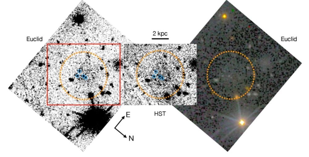 This figure is made up of cutout images from Euclid's VIS and the Hubble's Advanced Camera for Surveys. The central part stacks both images from the Hubble's ACS and shows extremely diffuse emissions around CDG-2s's four GCs. Euclid data confirms it. Image Credit: Li et al. 2026. ApJL *This figure is made up of cutout images from Euclid’s VIS and the Hubble’s Advanced Camera for Surveys. The central part stacks both images from the Hubble’s ACS and shows extremely diffuse emissions around CDG-2s’s four GCs. Euclid data confirms it. Image Credit: Li et al. 2026. ApJL*