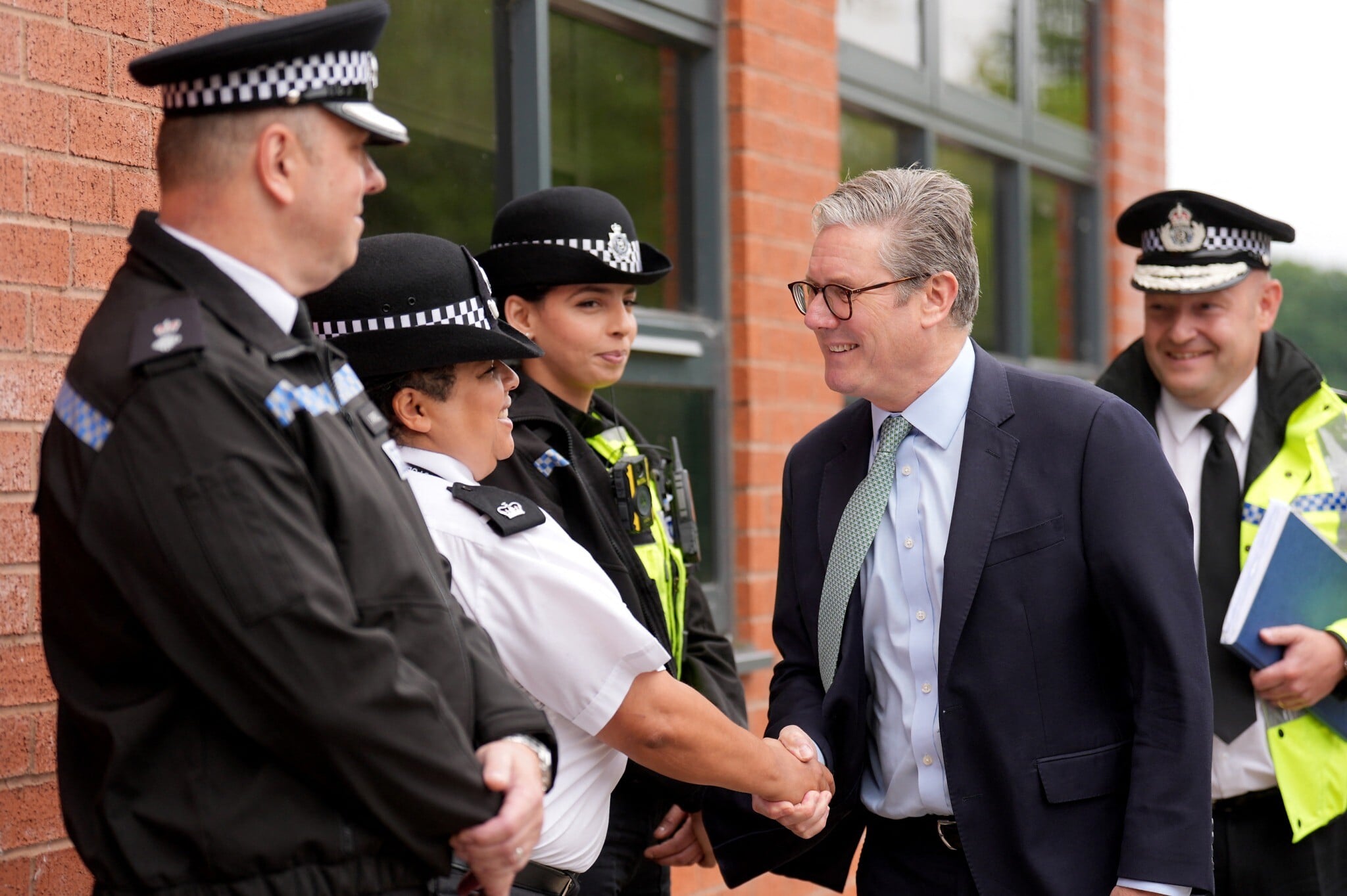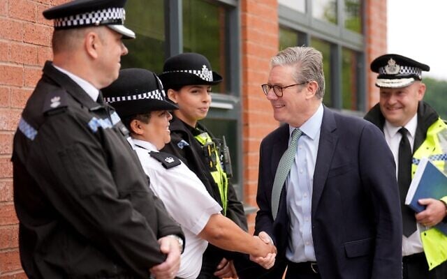 Britain’s Prime Minister Keir Starmer (C) arrives with West Midlands Chief Constable Craig Guildford to greet members of the West Midlands Police Force at Arden Academy in Solihull, West Midlands, on August 8, 2024. (Joe Giddens / POOL / AFP)