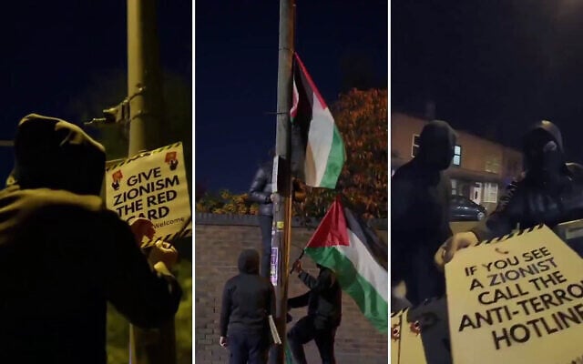 Demonstrators raise anti-Israel signs ahead of a Maccabi Tel Aviv – Aston Villa soccer game in Birmingham, UK, set for November 6, 2025. (Screenshots via X, via Deen1fied on Instagram)