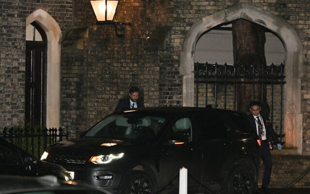 Two persons leave the home of Peter Mandelson in North-West London, February 6, 2026, as British police are searching, as part of a probe into potential misconduct stemming from his ties to the late Jeffrey Epstein. (AP Photo/ Thomas Krych)