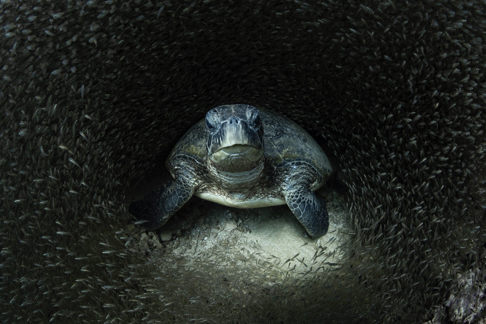 An underwater photograph of a sea turtle surrounded by glass fish© Aimee Jan “Green sea turtle surrounded by glass fish.” Bronze in the Underwater category