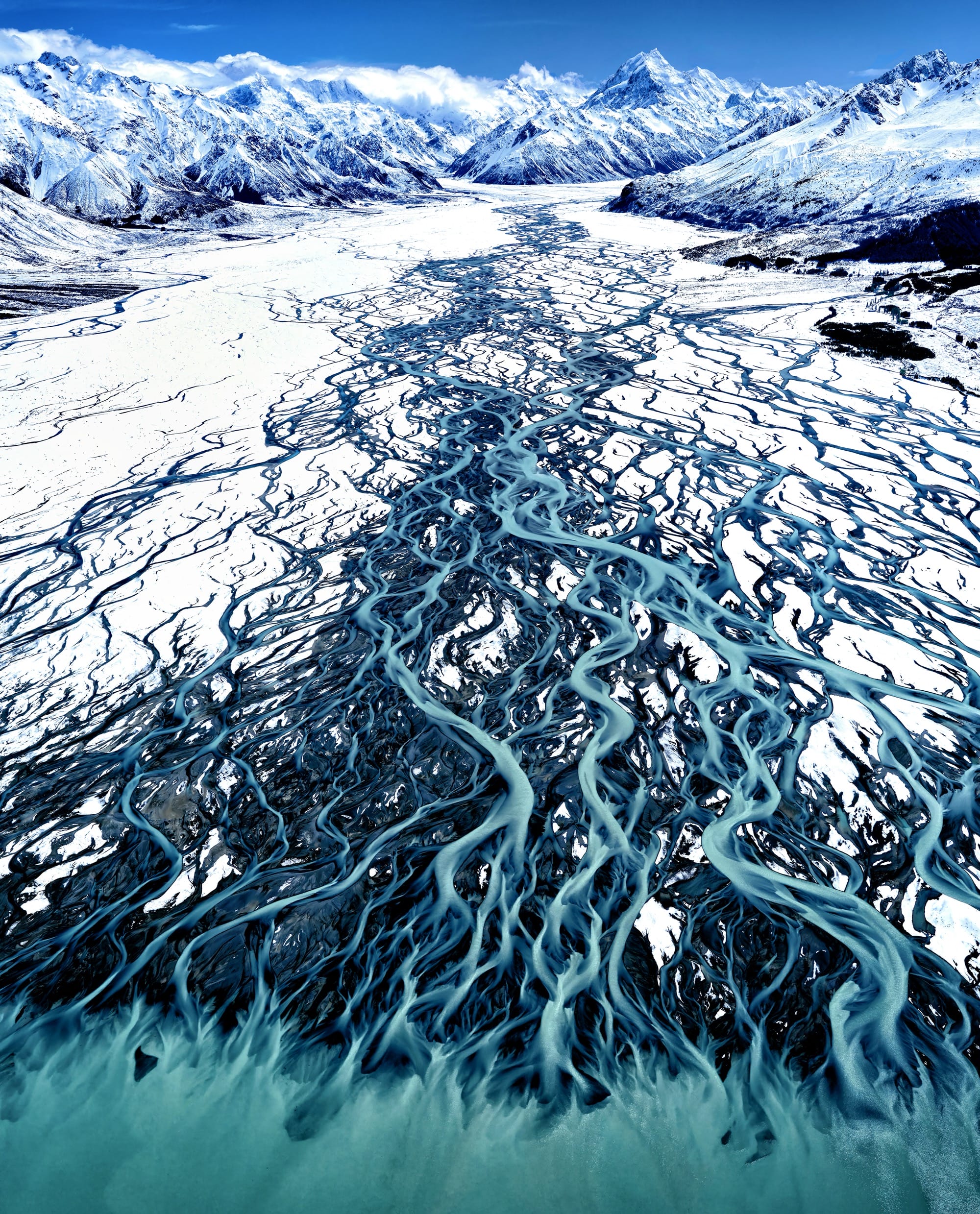 An aerial view of a large glacier with numerous colorful rivulets leading into open water© Stuart Chape, “Glacial blue.” Silver in the Planet Earth’s Landscapes and Environments category