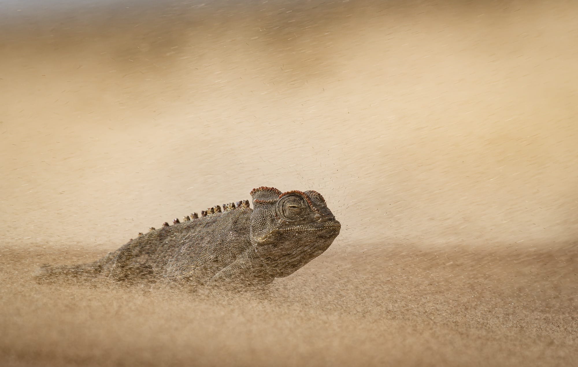 A lizard steels itself against blowing sand in the desert© Dewald Tromp, “Stoicism in a sandstorm.” Gold in the Behavior – Reptiles category