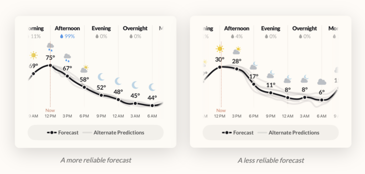 Understanding this uncertainty is crucial for planning your day. Most weather apps will give you their single best guess, leaving you to wonder how sure they actually are, and what else might happen instead. Will it actually start raining at 9am, or might it end up pushed off until noon? Will there be rain or snow? How sure are you? You can’t plan your day if you don’t know how much you can trust the forecast, or know what other possibilities might arise. Rather than pretending we will always be right, Acme Weather embraces the idea that our forecast will sometimes be wrong.