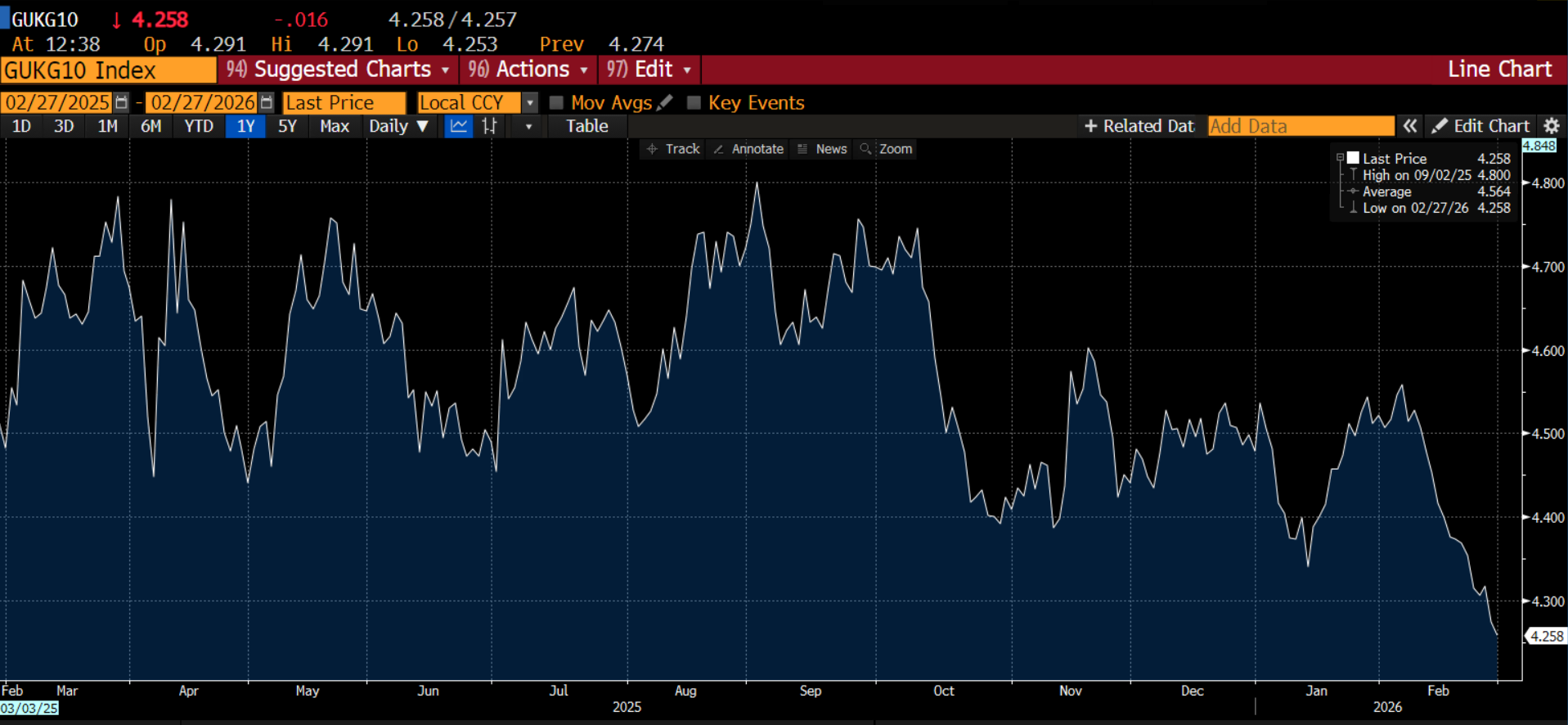 Gilt sales for the 2026/27 fiscal year are expected to be slashed by 20% to £245bn, the lowest level for 3 years. An improved fiscal picture is one reason why the UK bond market is a top performer globally this month, and 10-year Gilt yields are lower by 26bps. At 4.25%, the UK 10-year Gilt yield is at its lowest level for over a year.