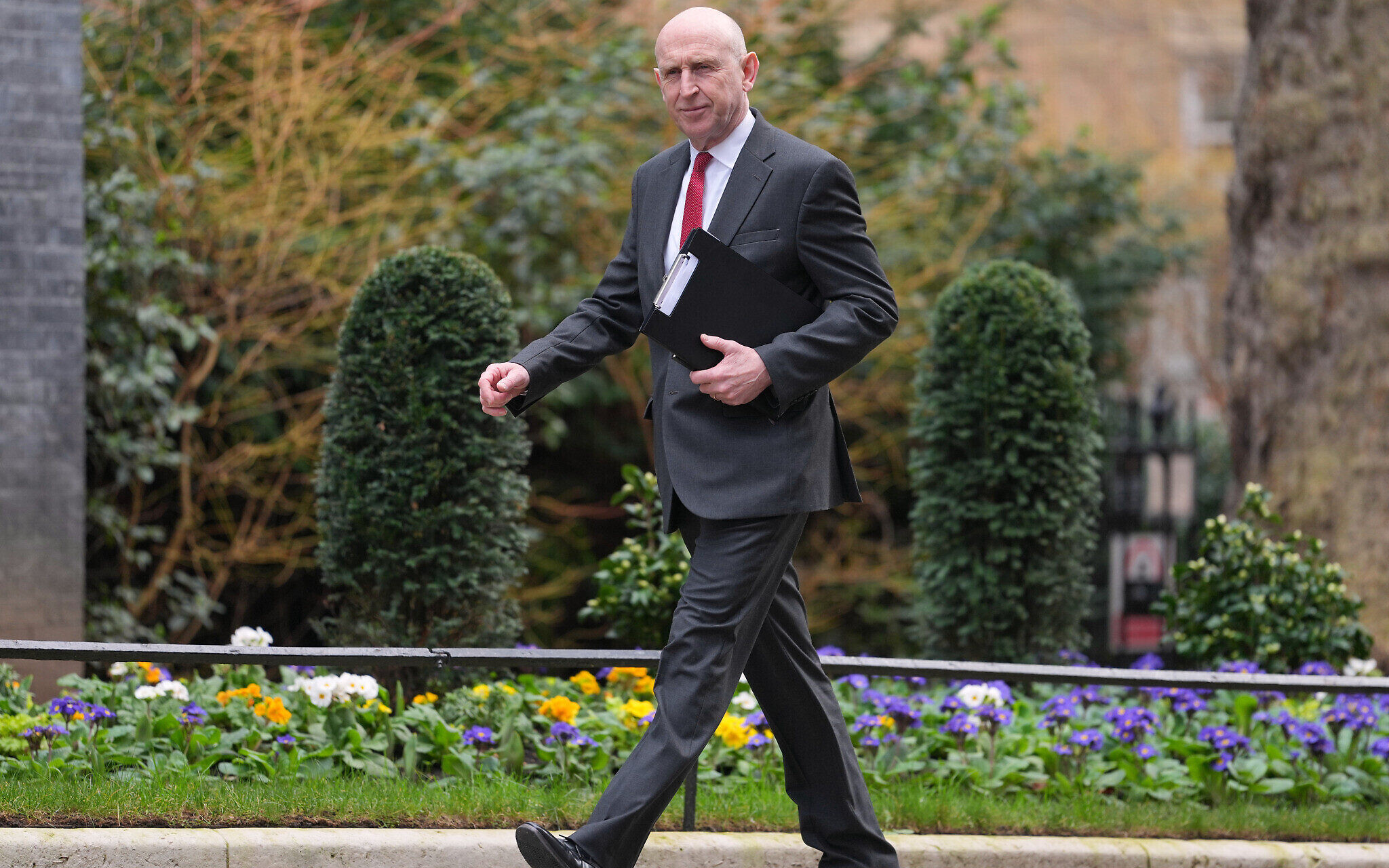 John Healey, Britain’s Secretary of Defense, arrives for a cabinet meeting at 10 Downing Street in London, February 24, 2026. (Kin Cheung/AP)