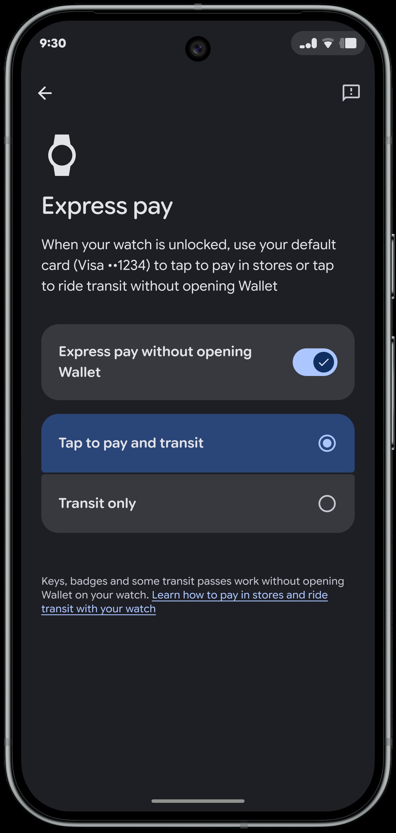 Express Pay will let you make NFC payments without having to first open the Google Wallet app. You can have this work for “Tap to pay and transit” or just “Transit only.” Just turn and tap your Pixel Watch 2+ to a retail terminal.