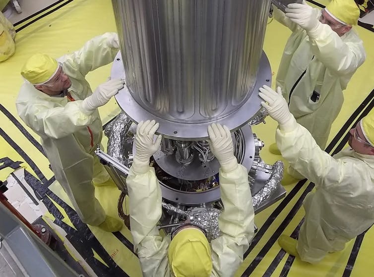 Engineers from Nasa and the National Nuclear Security Administration lower the wall of the vacuum chamber around a demonstration fission reactor.