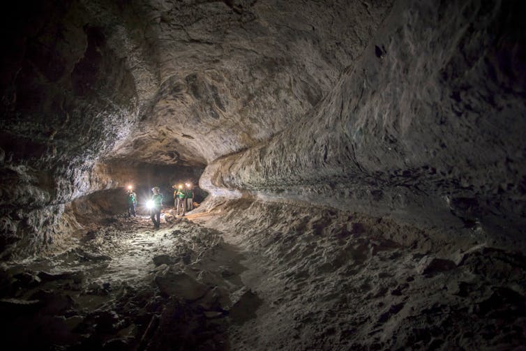 European astronauts explore a lava tube in the Canary Islands. Huge lava tubes on the Moon could protect human habitats from radiation and micrometeoroids.