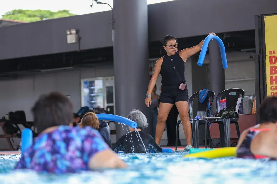 Ms Yu Poh Leng conducting an aqua fitness class at Delta Swimming Complex on March 10.