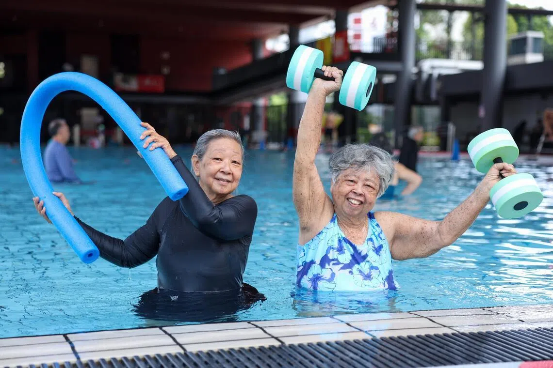 Sisters Yew Poh Leng (left) and Yew Poh Yok in an aqua fitness exercise at Delta Swimming Complex on March 10.