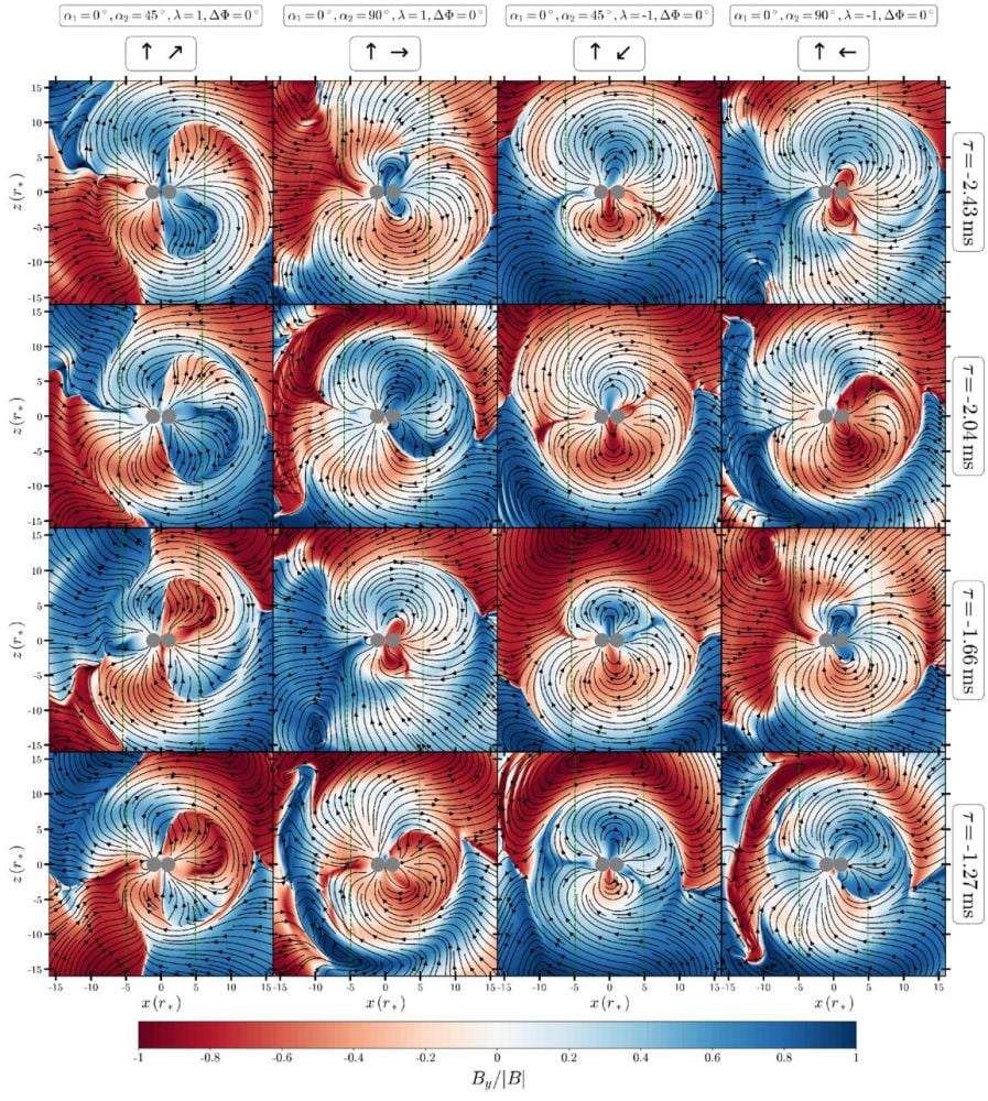 *Explaining everything in this figure would mean plunging deeply into a rabbit hole, but it’s basically showing how different alignments of the pair of neutron stars affects the magnetic fields. Above each column is a box with two arrows, illustrating different alignment configurations simulated in the work. Each row represents a different time in the merger, as indicated in a box on the right of each row. The complicated entwined magnetic fields are clear to see. Image Credit: D. Skiathas et al. 2025. ApJ*