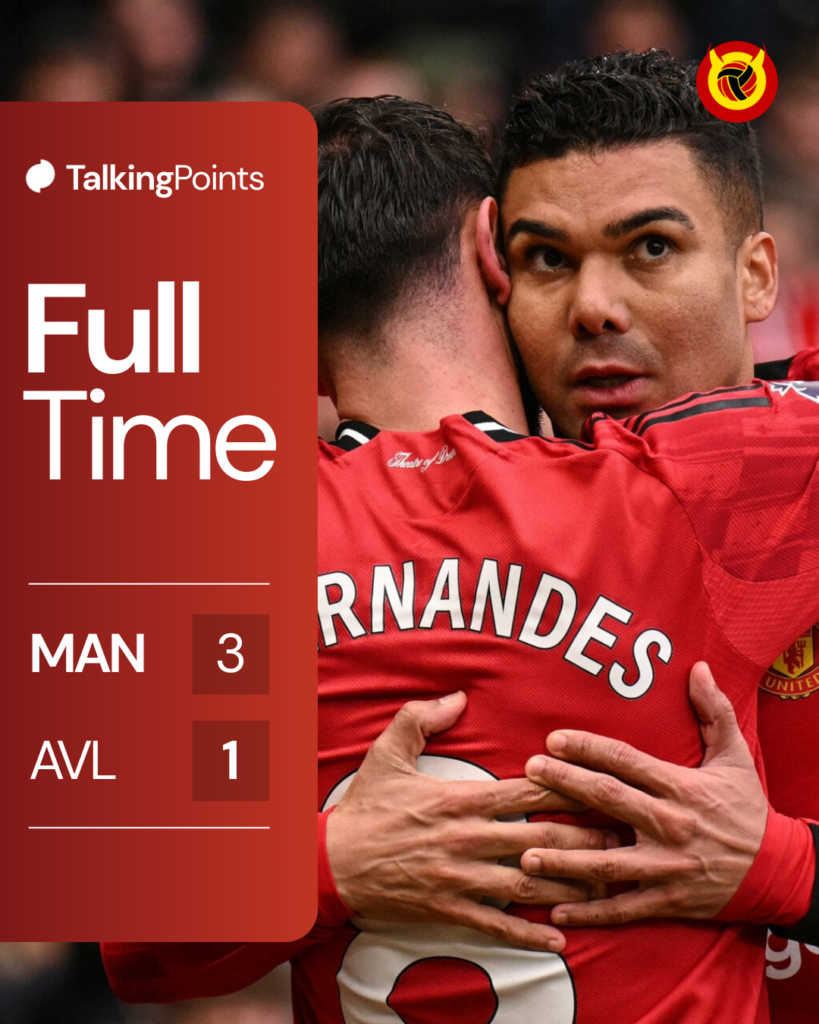 A dominant second-half performance gave Manchester United a 3-1 win over Aston Villa at Old Trafford with Casemiro, Matheus Cunha and Benjamin Sesko all on the scoresheet.