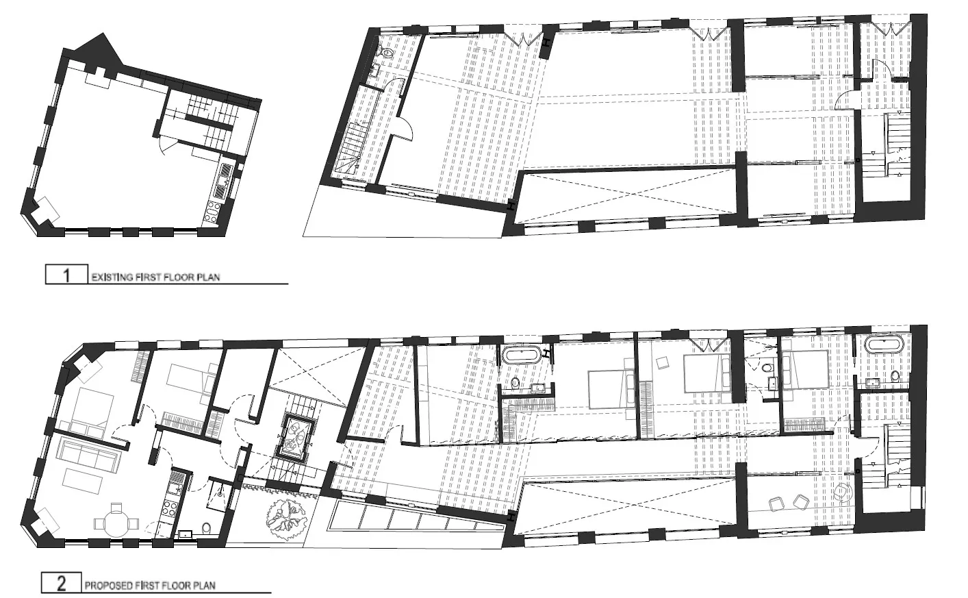 The new 1,162m² plans retain the ground floor commercial use at the Tenter Ground building and also include a new floor on the Bell Lane building for living spaces for the family. The buildings will be linked by a new circulation core containing stairs and a lift.