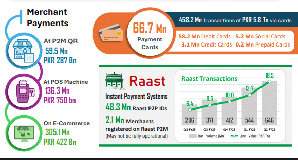 During the quarter, the Raast Instant Payment System maintained strong momentum, processing 645.7 million transactions valued at Rs. 18.5 trillion. Person-to-person (P2P) transactions rose to 603 million, an increase of 13 percent, with a total value of Rs. 15.7 trillion. Raast person-to-merchant (P2M) transactions increased to 33.6 million, amounting to Rs. 167.6 billion.
