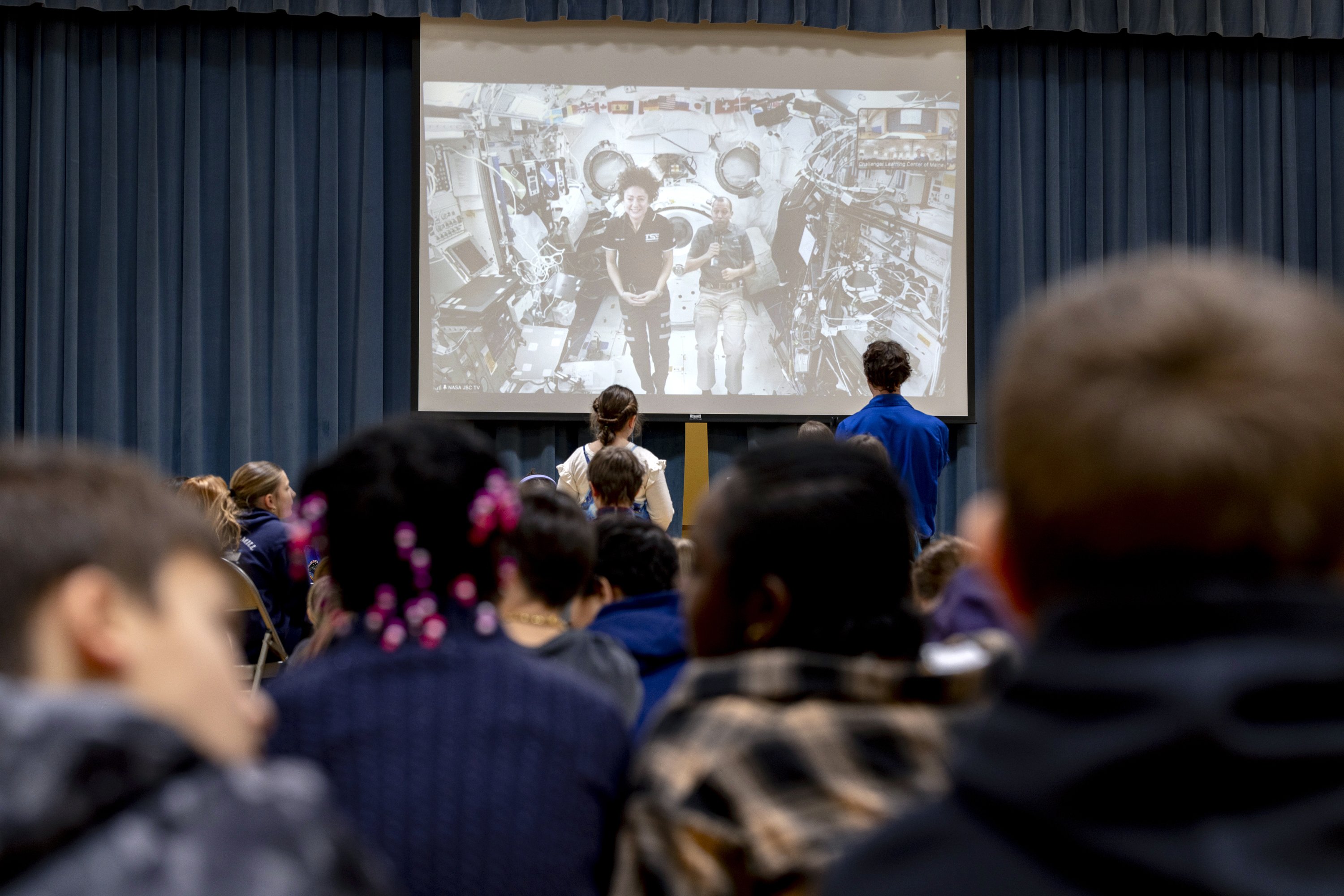 Meir, who left for the space station just last month, appeared live via video call to a gym full of students along with her colleague Christopher Williams. The astronauts floated in microgravity while answering fifth graders’ questions about living and working in orbit.