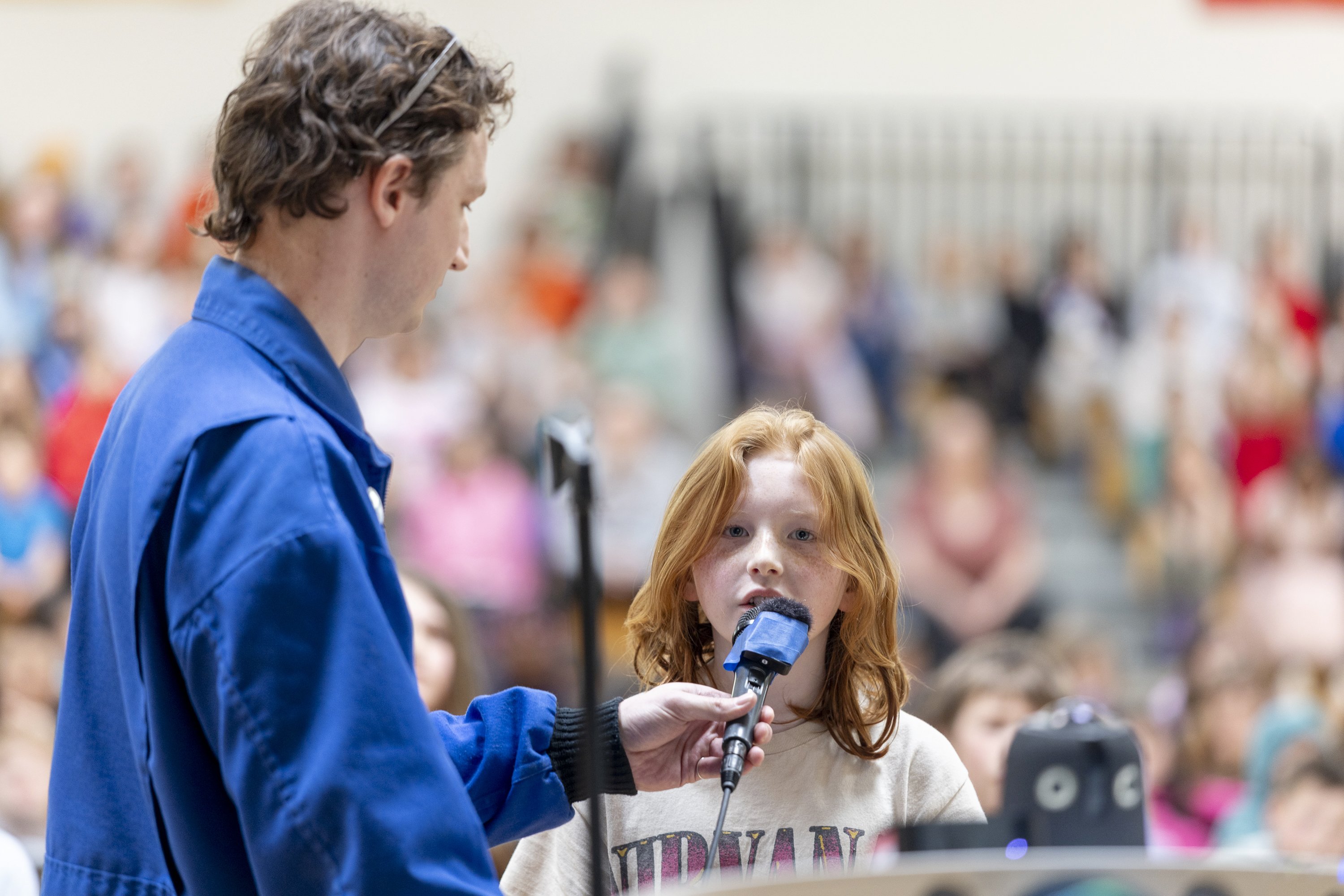 Harriet Beecher Stowe student Ruby Foster asks a question to astronauts Dr. Jessica Meir and Dr. Christopher Williams who are aboard the International Space Station on Friday, March 20, 2026. (Brianna Soukup/Staff Photographer)