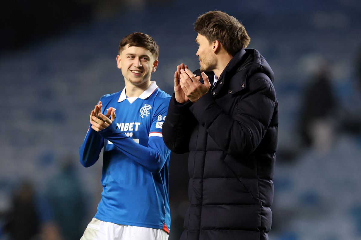 Mikey Moore of Rangers speaks to Danny Rohl