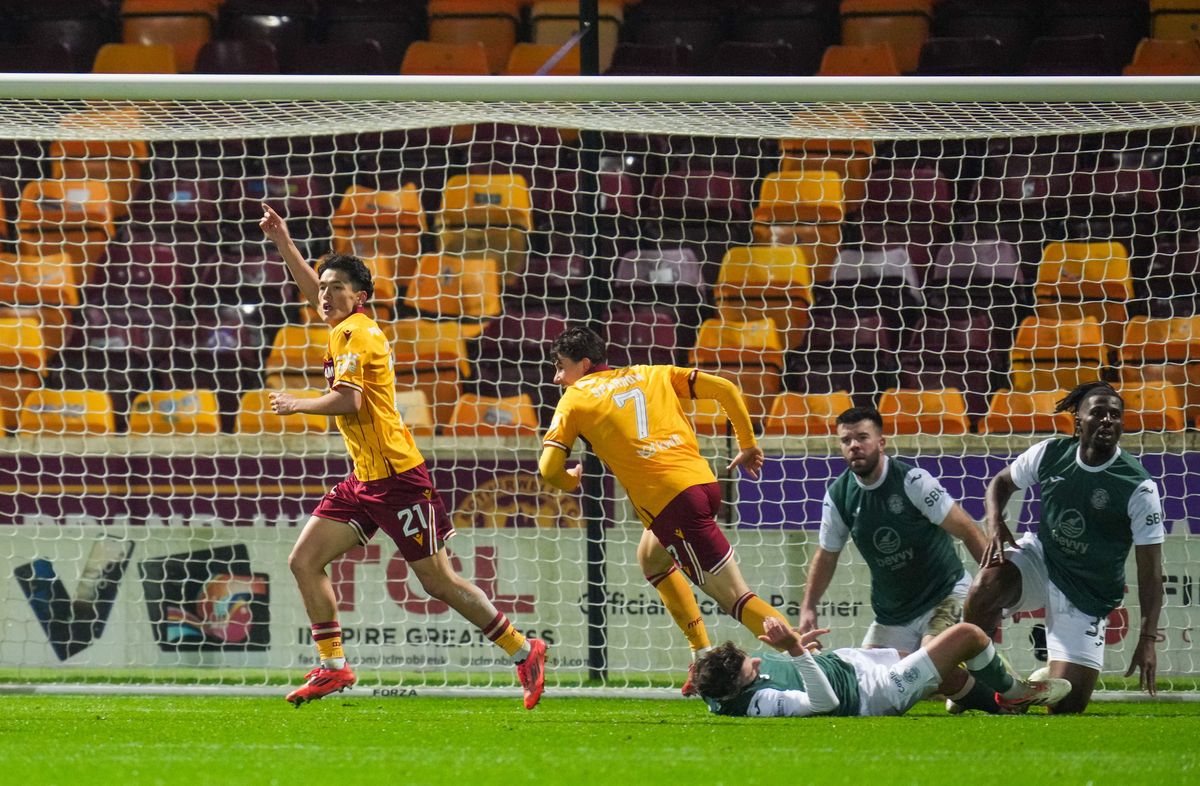 Elijah Just of Motherwell scores in the last Fir Park meeting with Hibs in November