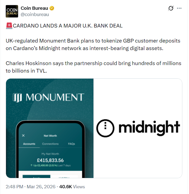 CARDANO LANDS MAJOR UK BANK DEAL AS MONUMENT BANK PLANS TOKENIZED GBP DEPOSITS
