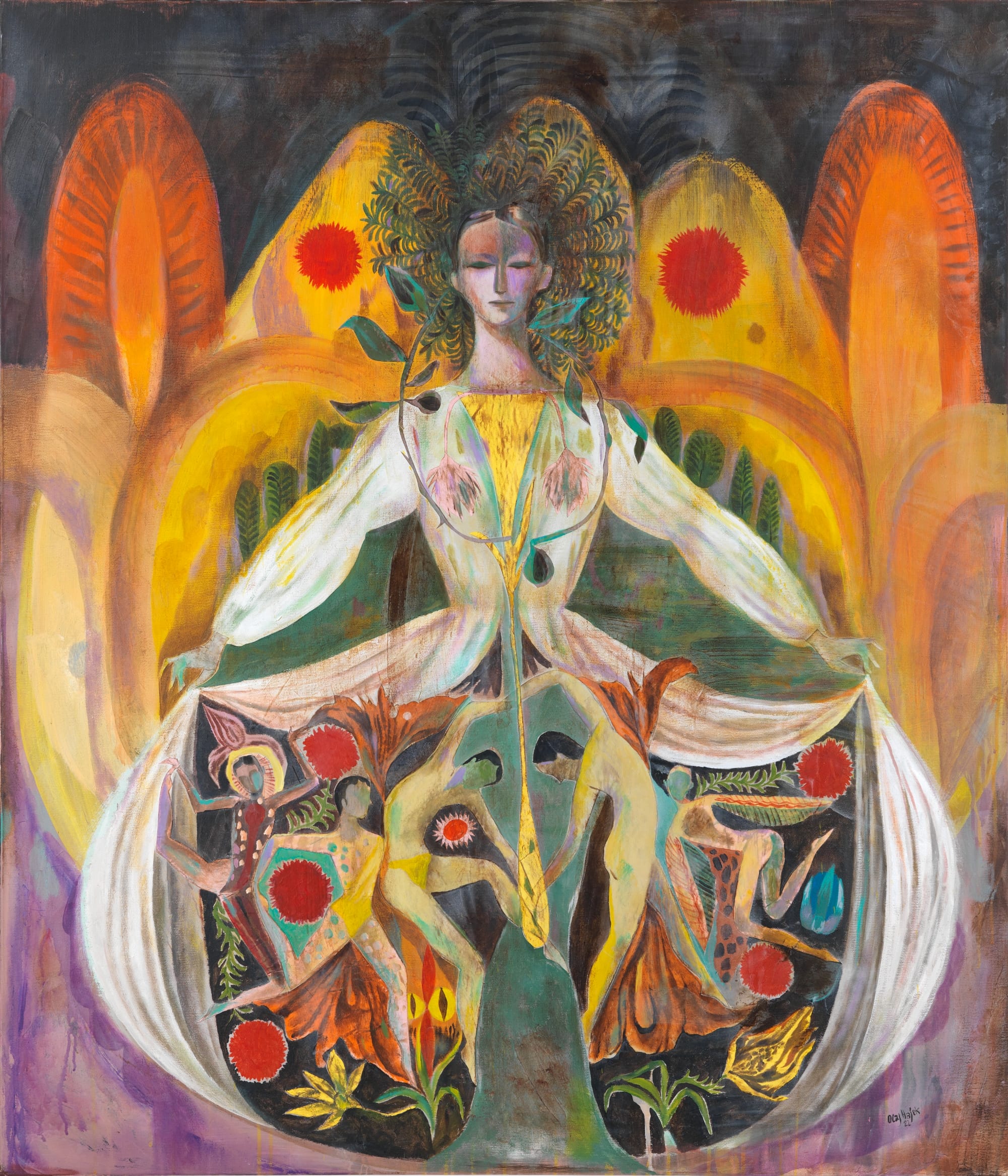 a surreal symmetric illustration by Olaf Hajek featuring a central figure in a long red gown, with two figures and a tree scene flanking the sides
