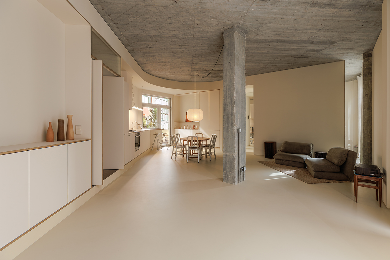 At the centre of this 124sqm apartment by MAM Studio, a structural concrete column has been left exposed, organising the plan around it. The project reworks a former artist’s residence into a pared-back home that follows the logic of the existing architecture. A triangular layout directs movement through the space, while 3.3m ceilings extend the volume. Beige epoxy flooring runs throughout, with plywood joinery forming the kitchen and storage. Two bedrooms sit toward the rear, separated by a mirrored partition. A 12sqm terrace extends the apartment outward.