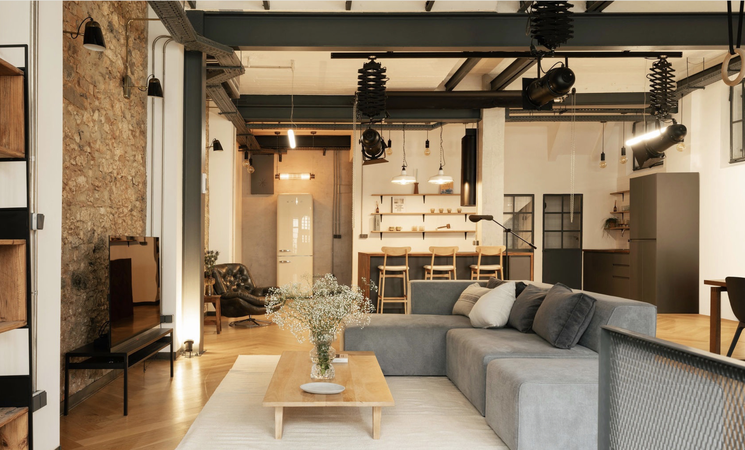 Set within a converted industrial building in Alcântara, this 262sqm loft has been adapted as a live-work space. Timber beams remain exposed across the ceiling, while steel-framed glazing introduces enclosed rooms within the open plan. Skylights draw light into the interior, falling across polished-concrete floors with integrated heating. Herringbone oak appears in parts of the apartment, creating contrast with the more industrial surfaces. The layout includes two bedrooms, multiple living areas and a private terrace.