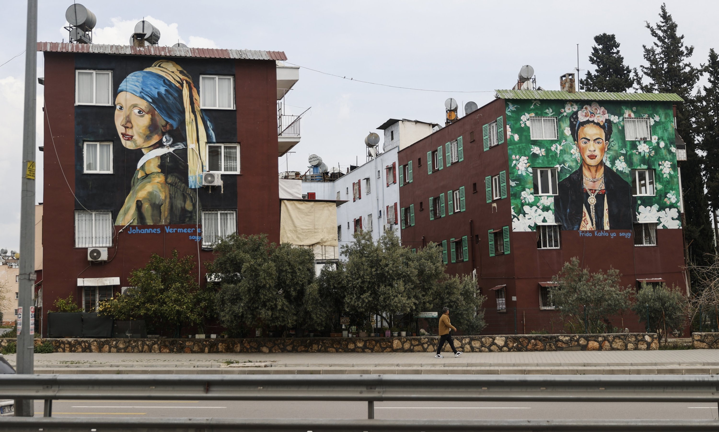Buildings featuring Johannes Vermeer’s “Girl with a Pearl Earring” and a portrait of Frida Kahlo, Mersin, Türkiye, March 25, 2026. (AA Photo)