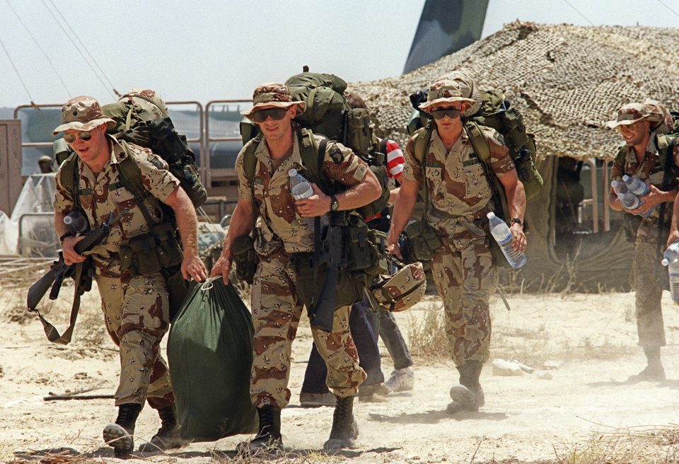 U.S. troops walk towards their barracks upon landing at Saudi Dhahran air base on Aug. 21, 1990.