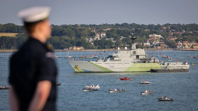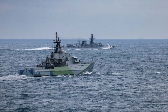 HMS Tyne foreground with frigate HMS Iron Duke shadowing Russian vessels in the Channel in February