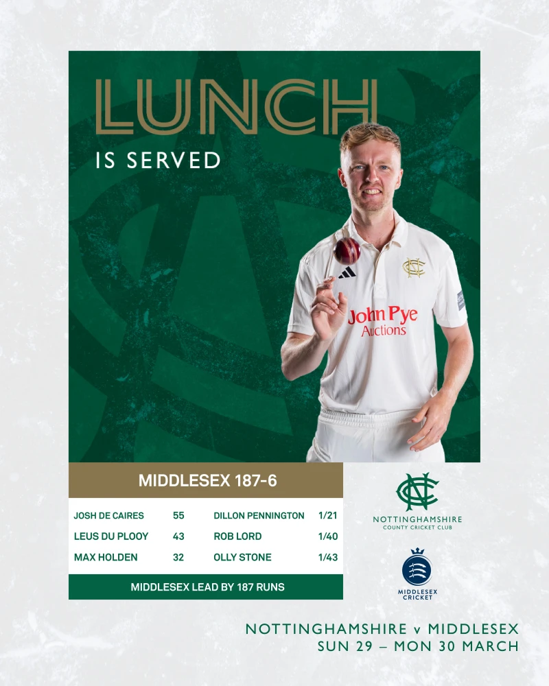 IN SUMMARYNottinghamshire are batting on day two of their final pre-season friendly of 2026 against Middlesex at Trent BridgeThe visitors made 187-6 from 45 overs of their much-truncated innings that concluded at lunch todayKyle Verreynne is making his first appearance of the summer in Nottinghamshire whitesBoth sides have named squads of 13 to take part in the match