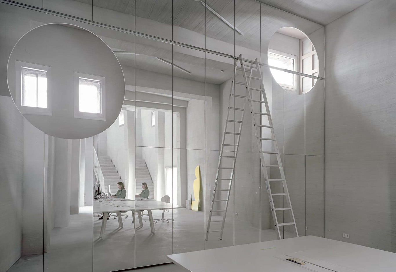 Arno Brandlhuber is revered for transforming brutalist buildings into radical live-work spaces, and San Gimignano, in east Berlin, cemented his reputation. The two slim industrial towers were built in the 1950s by the GDR to process graphite, and in their abandoned state reminded the architect of the medieval city of San Gimignano. The main, habitable tower stands 42.6 metres high, its raw concrete structure left exposed. Brandlhuber’s practice b+ reworked the interiors between 2018 and 2021, and it now provides around 300sqm of internal space arranged vertically.