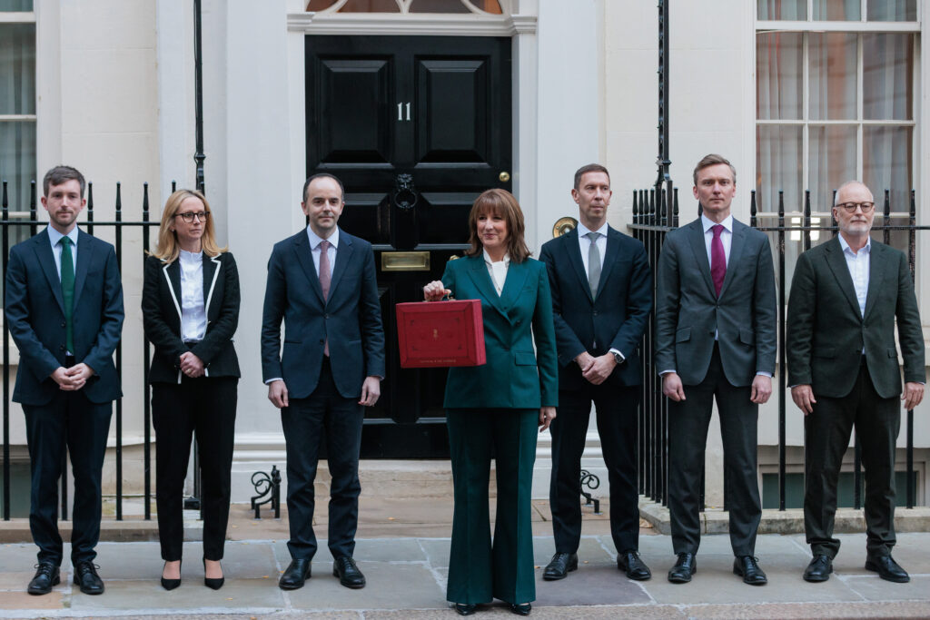 Chancellor Rachel Reeves and Pensions Minister Torsten Bell, second from the right, present the budget despatch box on Nov. 26, 2025. | Mark Kerrison/In Pictures via Getty Images