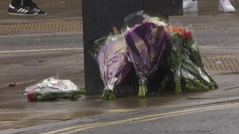On Sunday, forensic teams were seen on their hands and knees on the pavement, examining the scene for evidence. Flowers had also been left nearby.