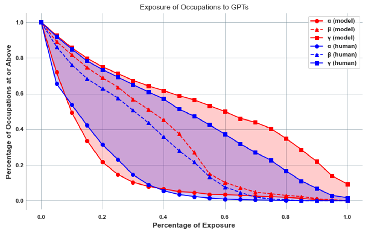 The 𝛽 and 𝜁 lines here assume much larger potential LLM impacts on jobs by incorporating forward-looking projections for “anticipated LLM-powered software.”
