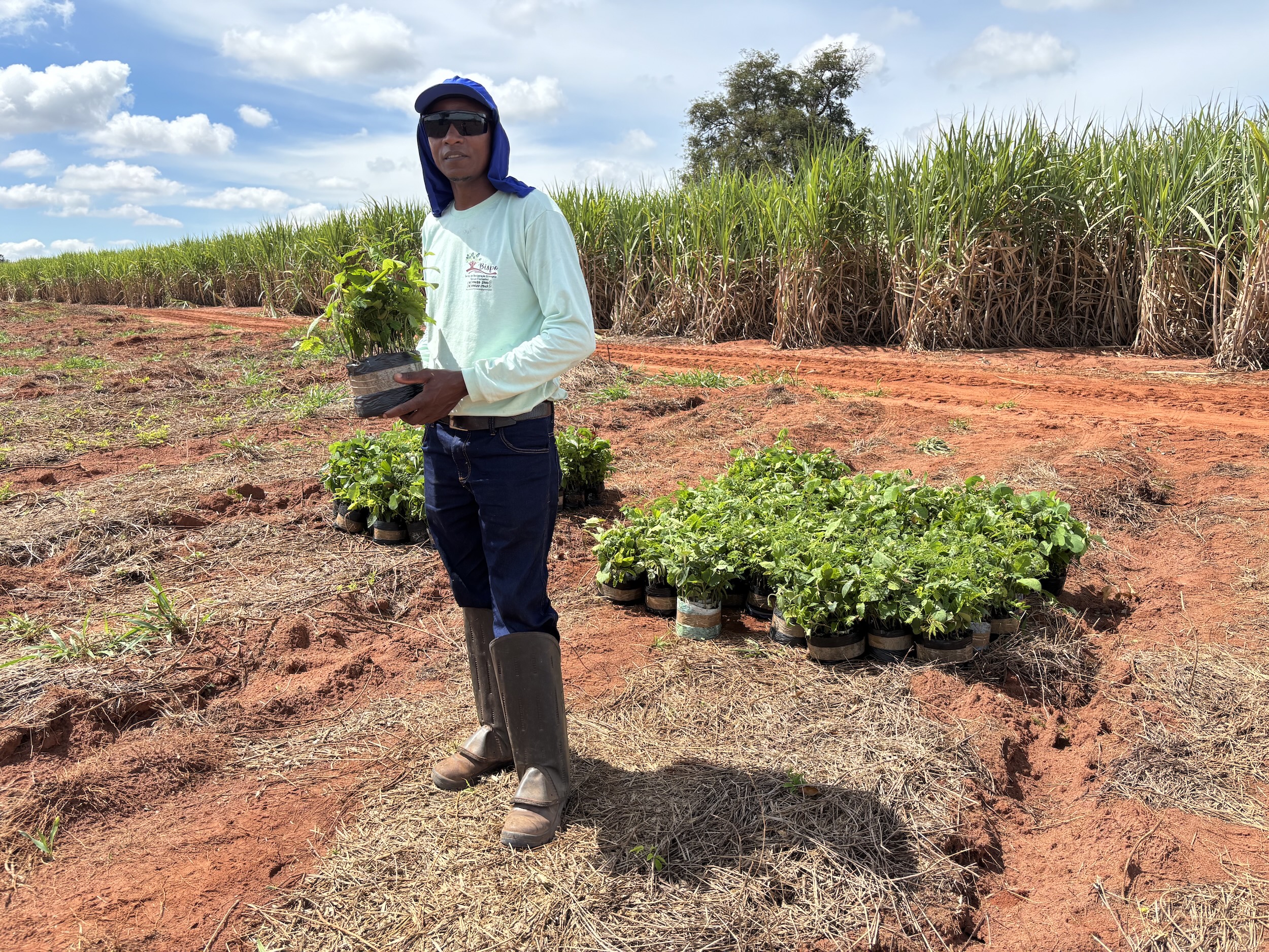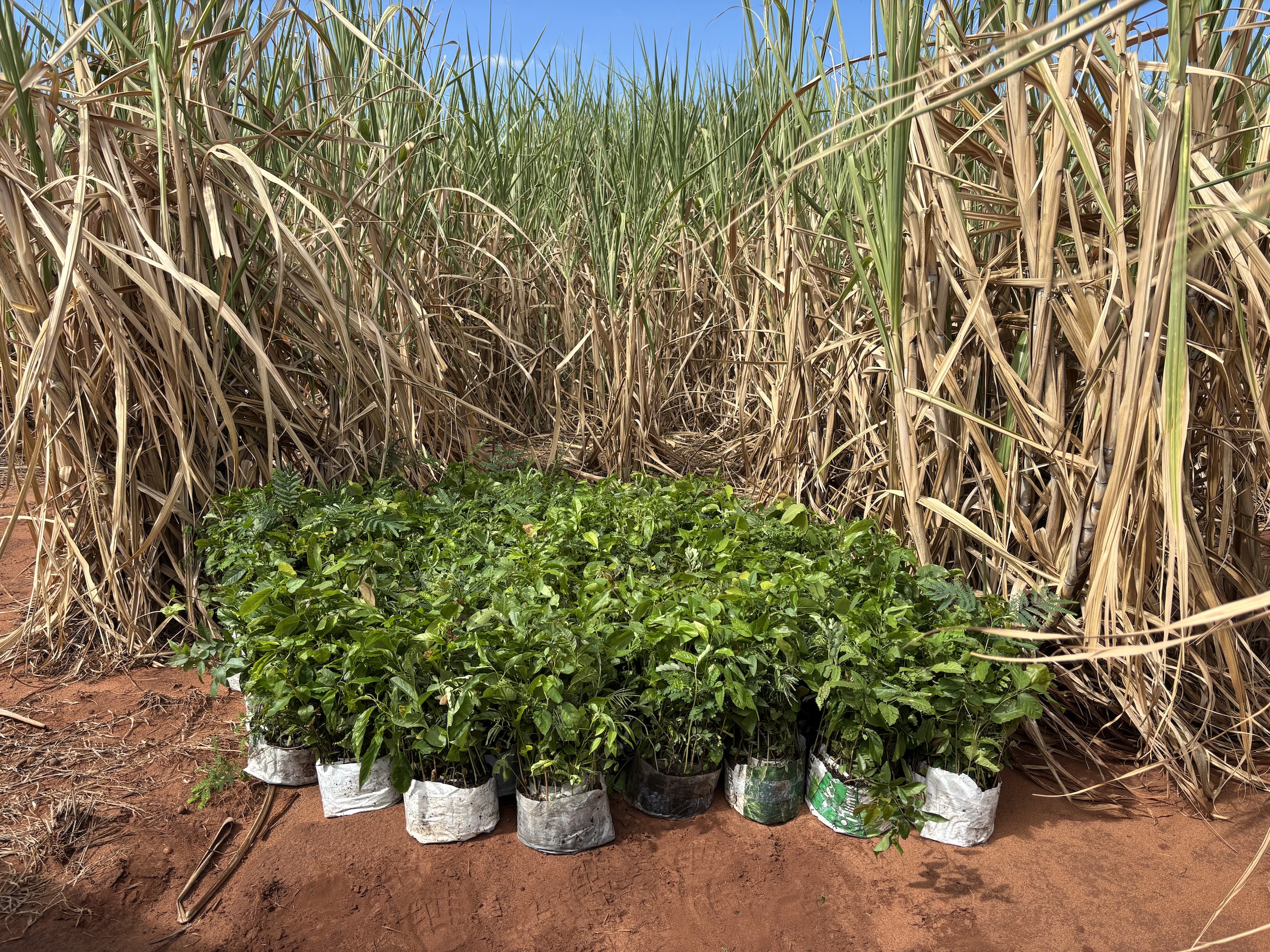 Seedlings for reforestation amid sugarcane fields. Image by Sibélia Zanon.