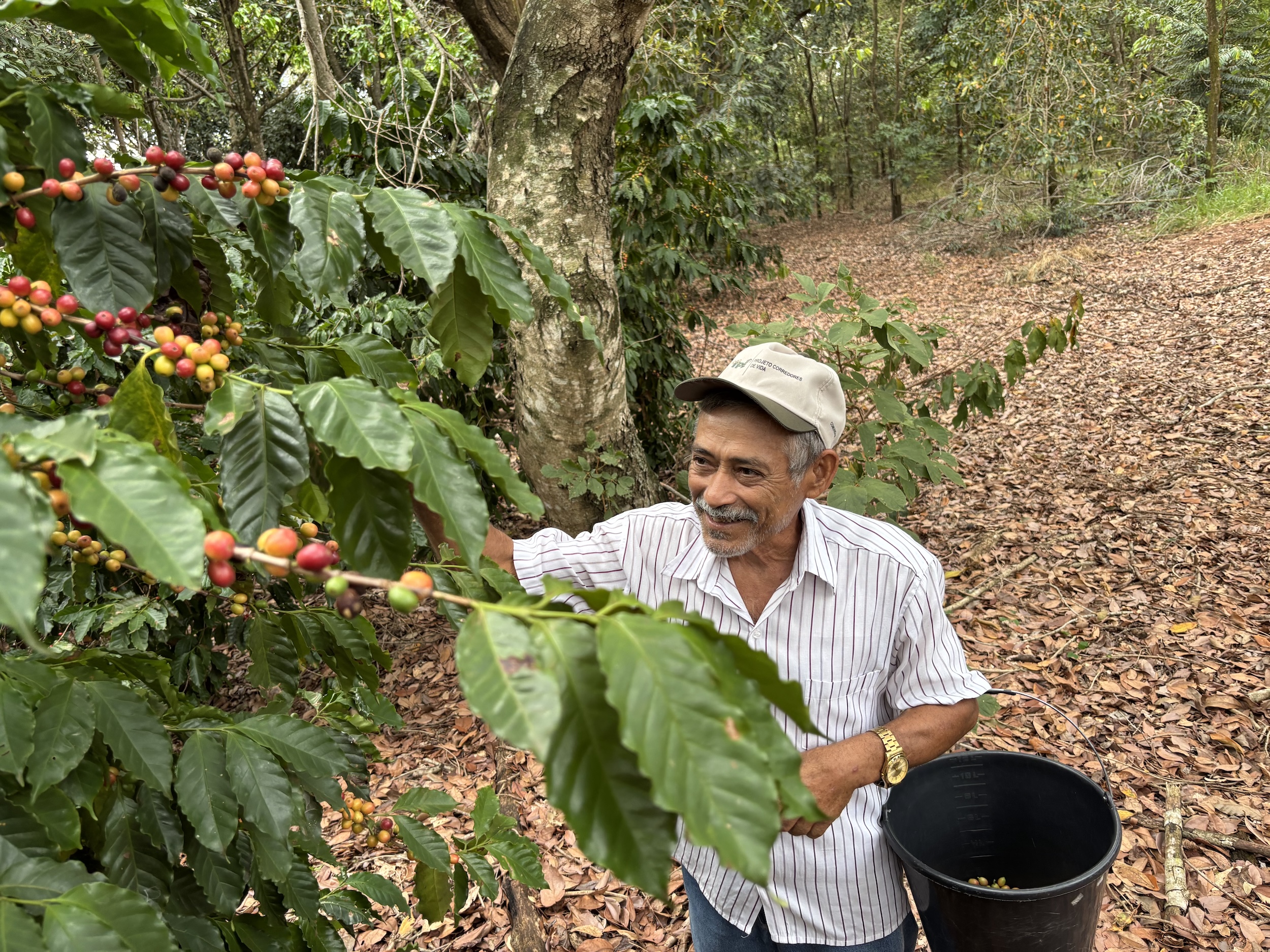 Farmer Chiquinho harvests coffee in Mirante do Paranapanema, São Paulo state. Image by Sibélia Zanon.
