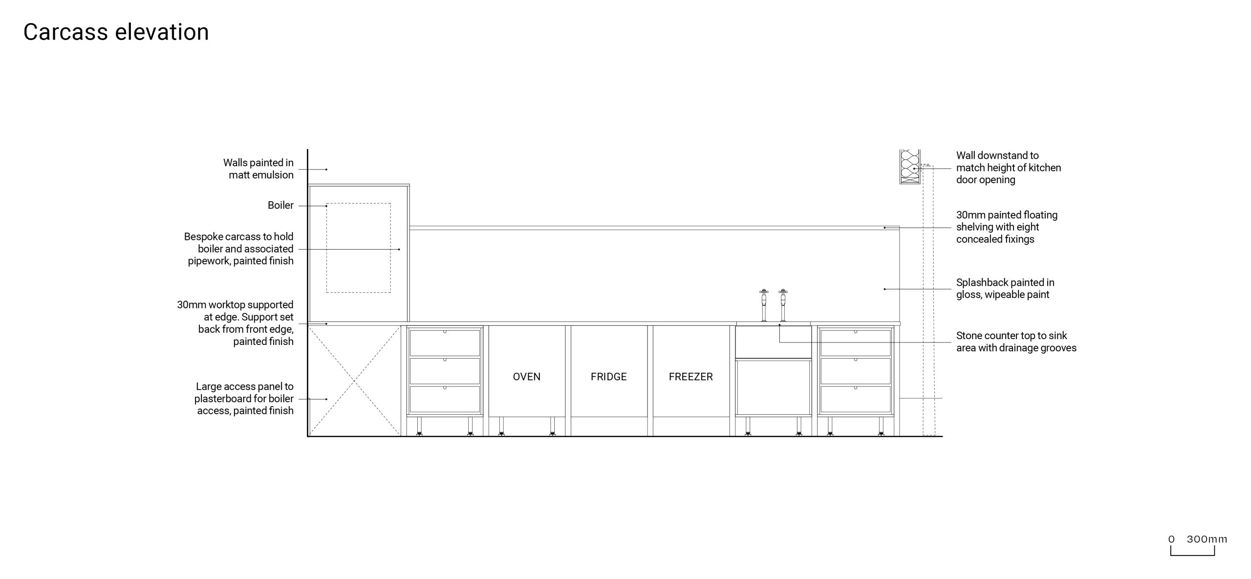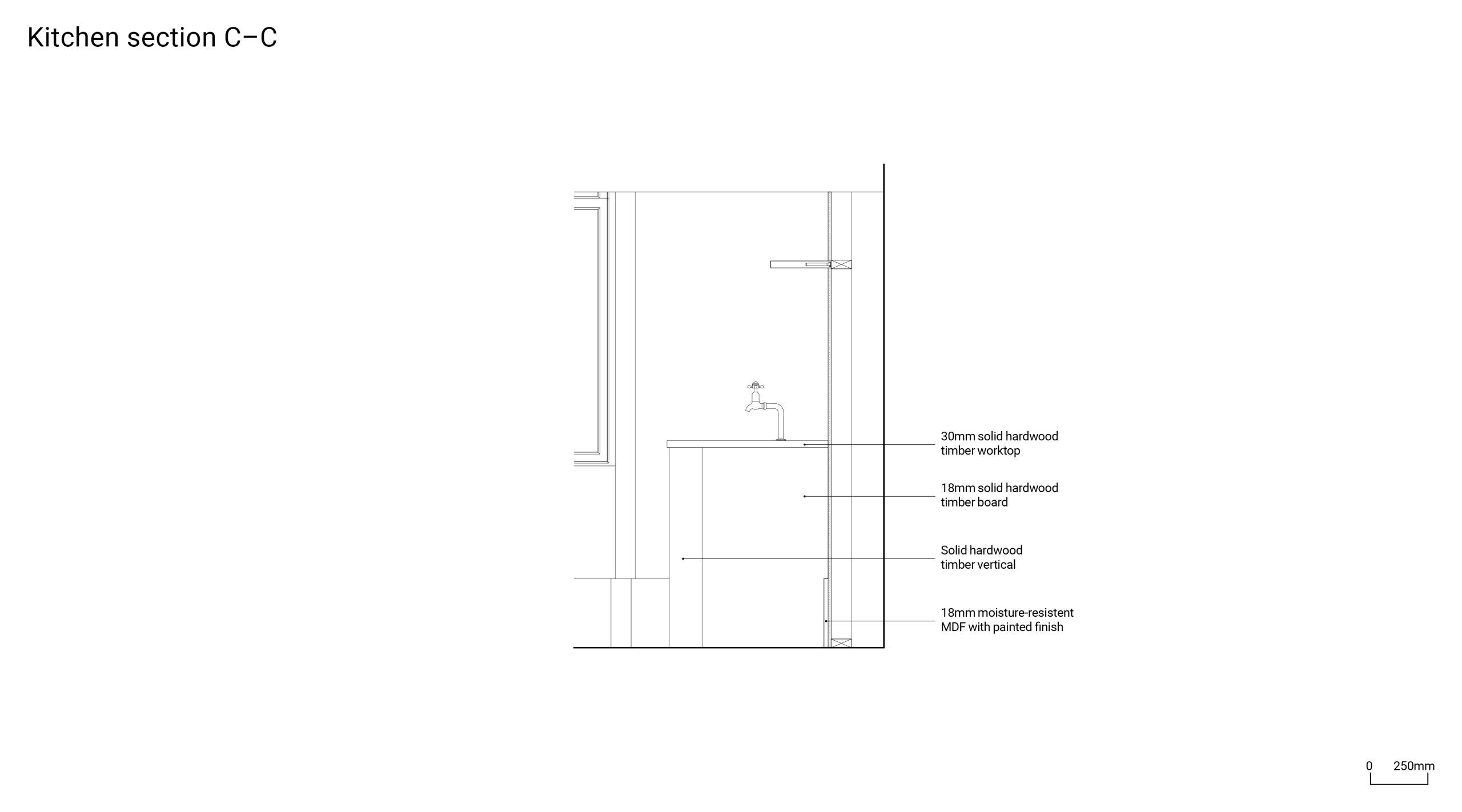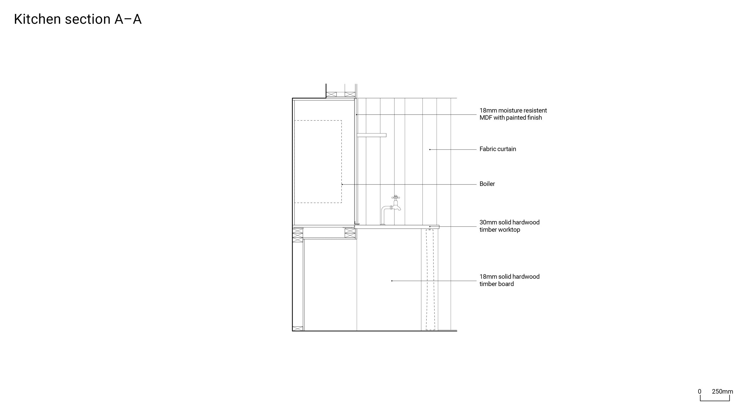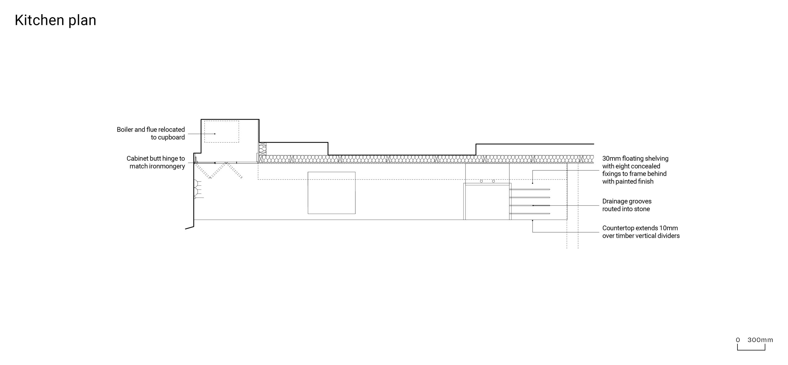 The kitchen, fabricated by Studio Silvan, is formed entirely from surplus timber sourced from previous projects. Brown oak, oak,cherry, Douglas fir and ash are arranged in a subtle gradient that celebrates tonal and textural variation. The internal carcasses are constructed from repurposed Valchromat, introducing moments of colour within an otherwise restrained composition. British-sourced stone, supplied as offcuts by Britannicus Stone, provide a playful, vibrant patchwork of surfaces. Frosterley, Ledmore, Swaledale Fossil and Stoneycombe offcuts are arranged according to the existing slab dimensions. Three stone slabs, salvaged from Leith-based mason AB Mearns, were assembled into a monolithic Stonehenge-like mantel. Raw edges of the stone were left exposed to celebrate the material in its natural state, while a single slab was rotated in contrast. The existing timber flooring was retained to honour its severe character. Oversized, gloss-painted skirting boards were introduced as a counterpoint.
