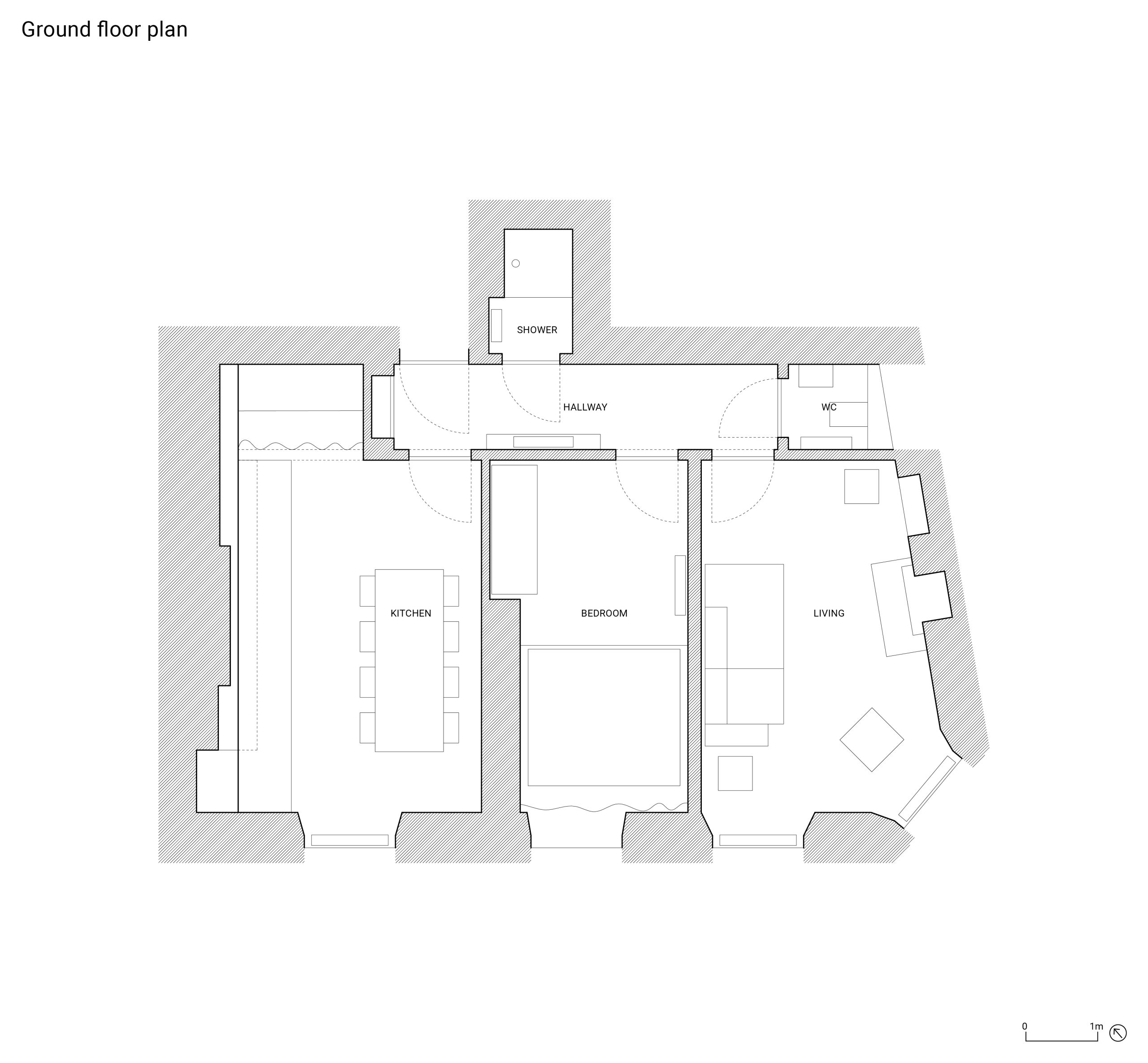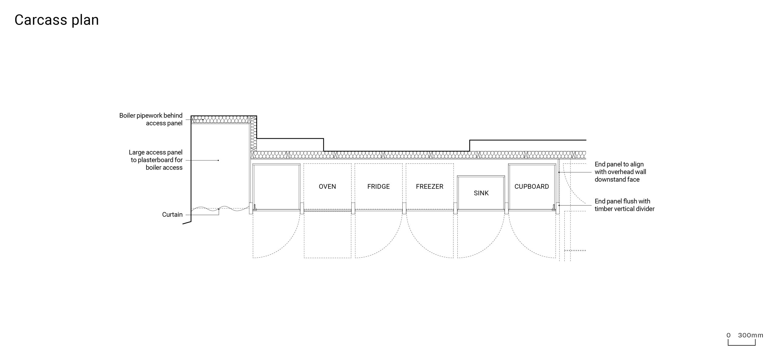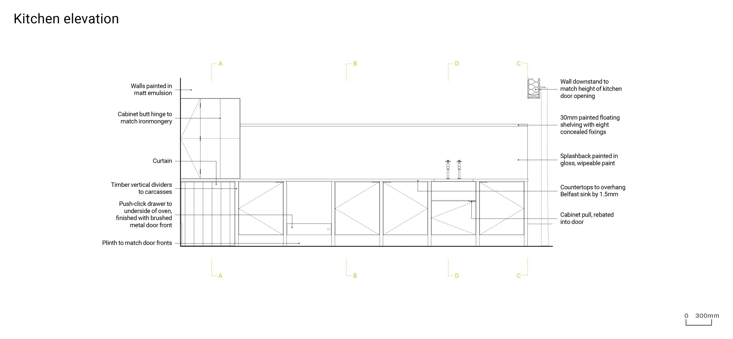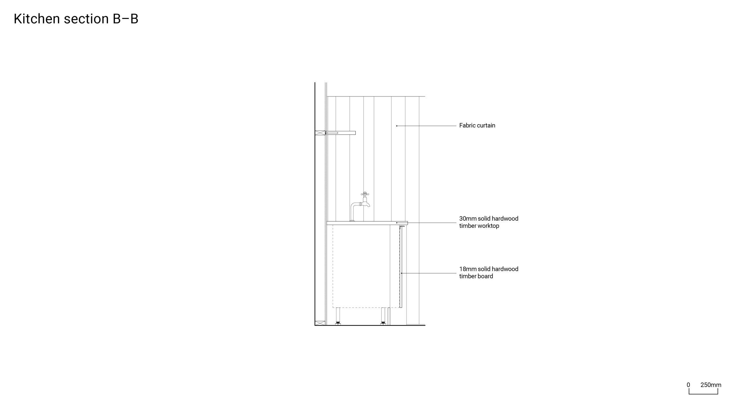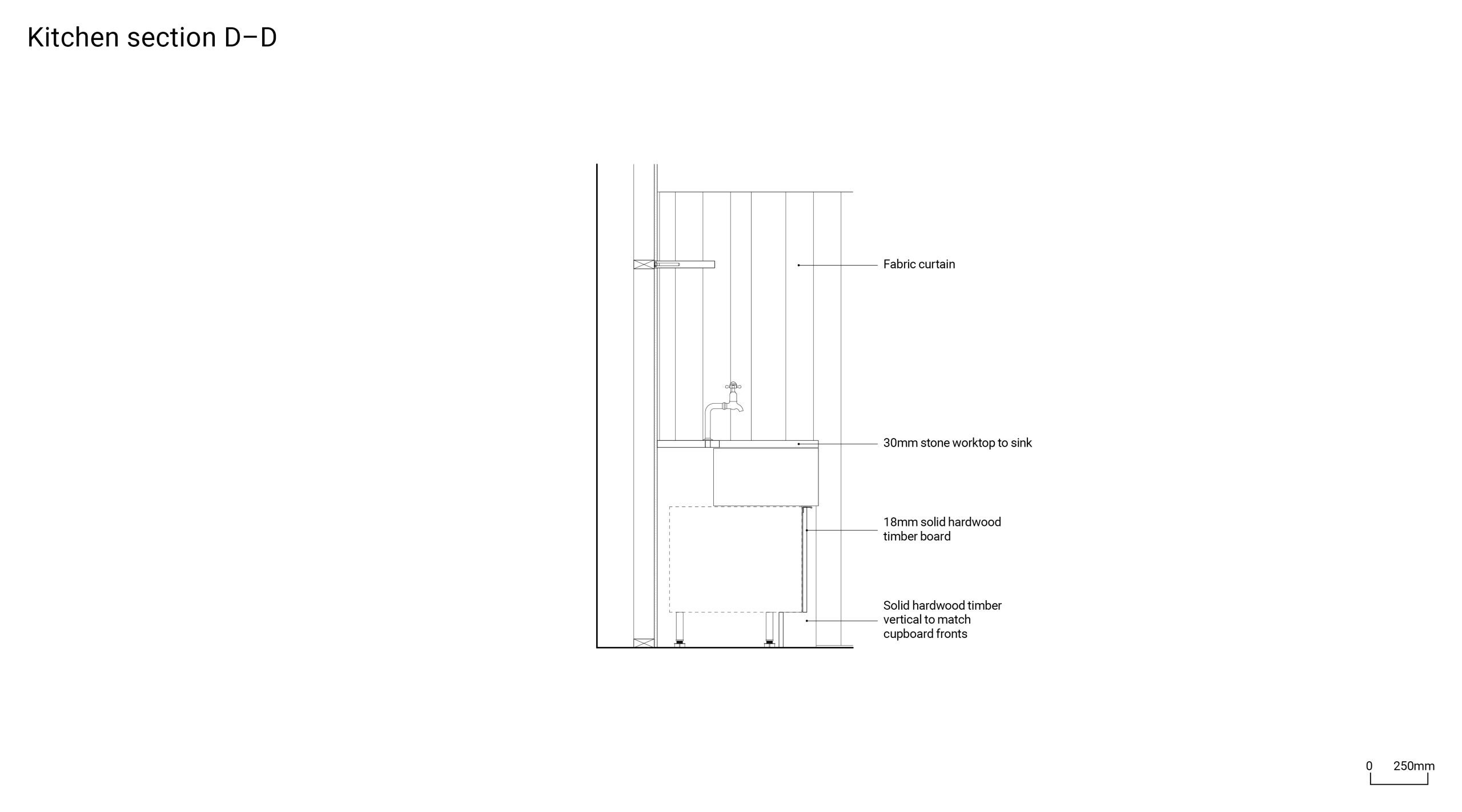 The kitchen, fabricated by Studio Silvan, is formed entirely from surplus timber sourced from previous projects. Brown oak, oak,cherry, Douglas fir and ash are arranged in a subtle gradient that celebrates tonal and textural variation. The internal carcasses are constructed from repurposed Valchromat, introducing moments of colour within an otherwise restrained composition. British-sourced stone, supplied as offcuts by Britannicus Stone, provide a playful, vibrant patchwork of surfaces. Frosterley, Ledmore, Swaledale Fossil and Stoneycombe offcuts are arranged according to the existing slab dimensions. Three stone slabs, salvaged from Leith-based mason AB Mearns, were assembled into a monolithic Stonehenge-like mantel. Raw edges of the stone were left exposed to celebrate the material in its natural state, while a single slab was rotated in contrast. The existing timber flooring was retained to honour its severe character. Oversized, gloss-painted skirting boards were introduced as a counterpoint.