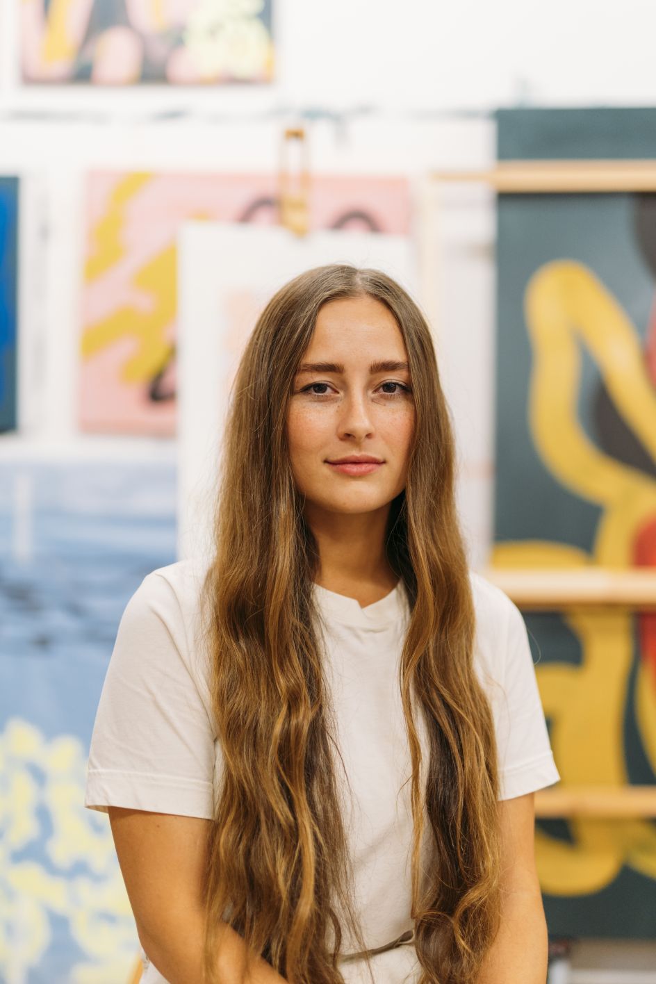 Some paintings end up with floating elements; others sit top-heavy, awkward, full of interruptions. She draws and adjusts until the composition feels right, but never expected. Crucially, though, the introduction of unwieldy materials and repetitive actions is designed to disrupt the ease of this method—preventing the process from becoming purely automatic and instead introducing what she describes as “moments of resistance and negotiation”.