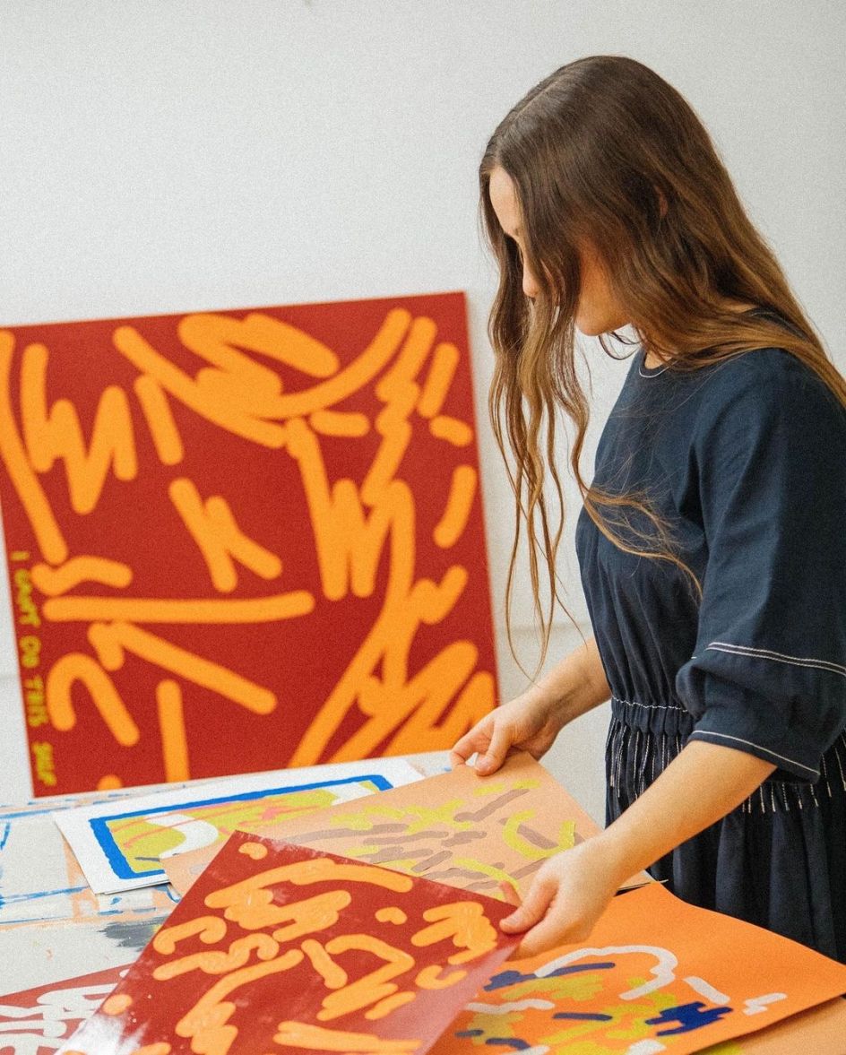 Jenny describes the act of including text in the painting as “prescriptive”. It’s grounding: not cathartic, not confessional, but pragmatic. Anyone working in a space that doesn’t quite fit them—by class, by geography, by background, by any of the dozen ways the creative industries still manage to make people feel like guests in their own field—might find something to sit with here.